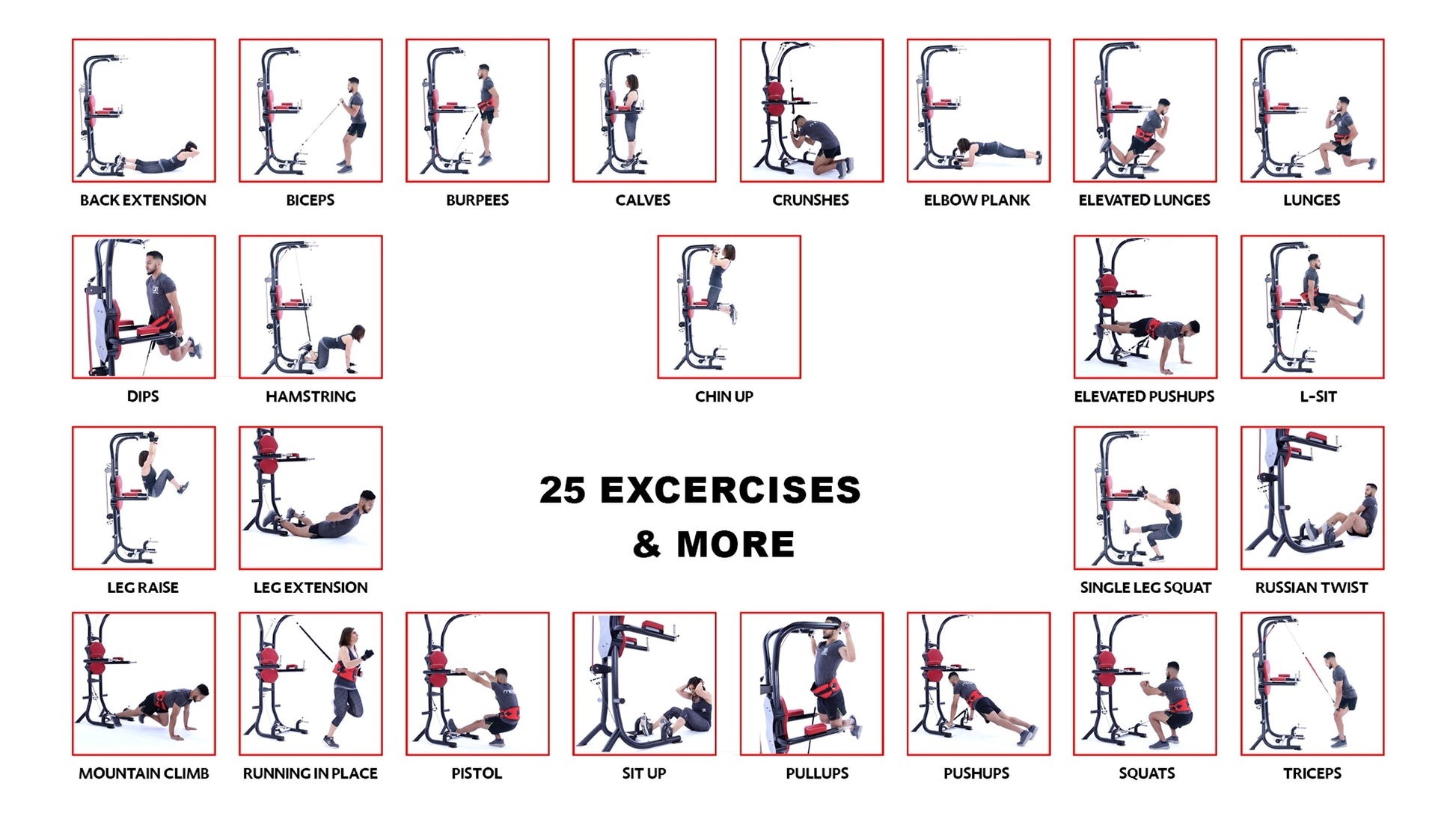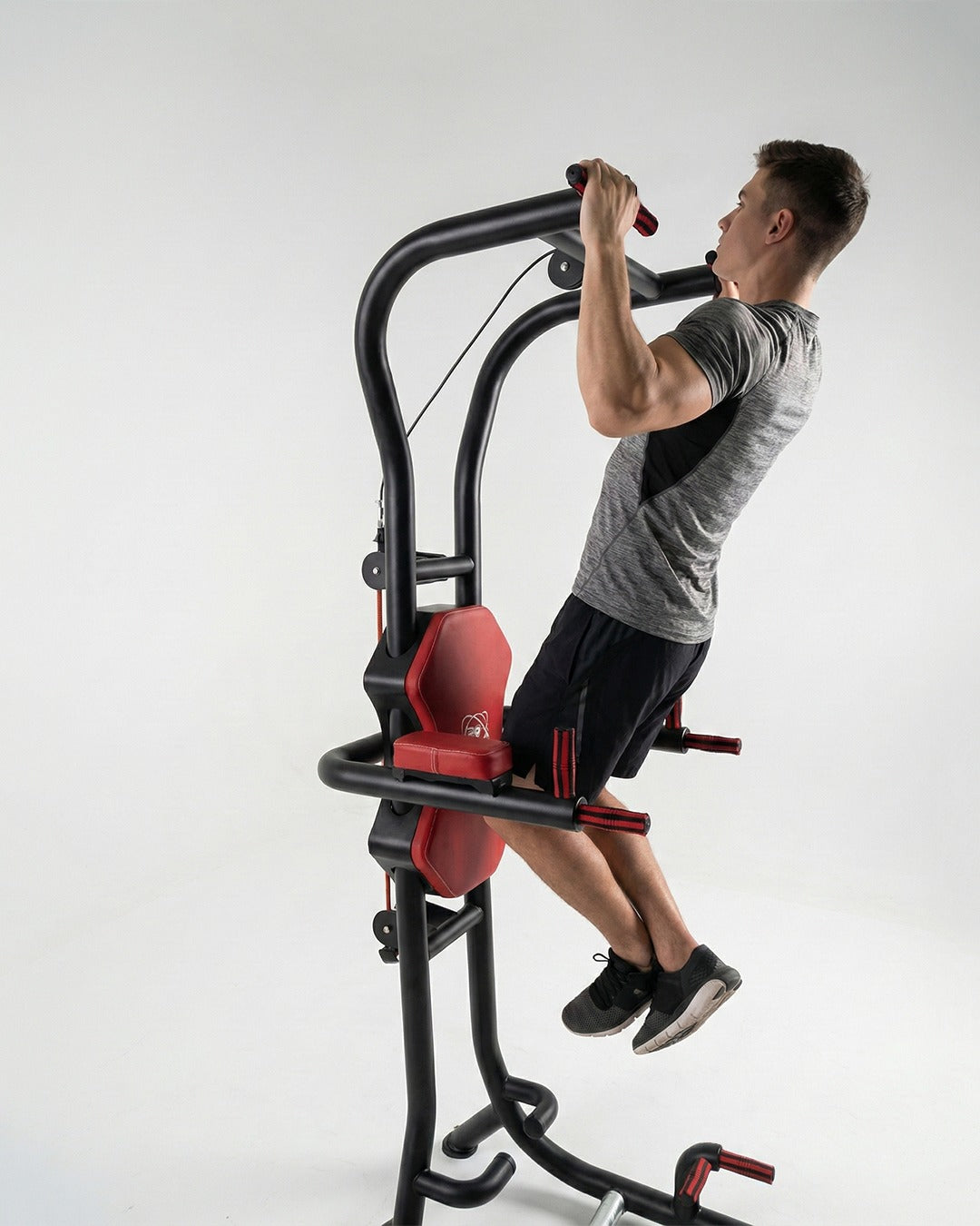● The Power Tower offers Assistance/ Resistance modes with special anchor system and 3 elastic tubes to make the training easier or tougher depending on the athlete's discretion and fitness level.